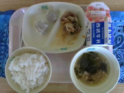 今日の給食は、ご飯、牛乳、ポークシュウマイ、豚キムチ、わかめスープ、ももゼリーが出ました。特に豚キムチは程よい辛味と旨味で美味しく、ご飯がすすみました。また、ももゼリーはスッキリとした味で爽快感がありとても美味しかったです。3−4給食委員