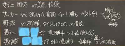天候が心配されましたが、どの部も大会初日を予定通りに実施できました。バレー部は遅くまで時間がかかりご心配をおかけいたしました。野球部はサヨナラランニングホームラン、バレー部は3試合フルセットと激戦、接戦を勝ち抜いています。男子テニス部、優勝おめでとう!
