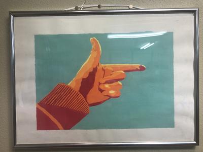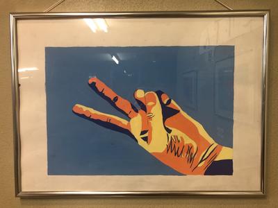 美術部2年生が展示を行いました。手の動きを決め、色面構成で描きました。