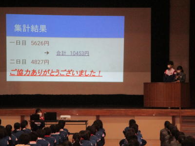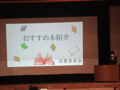 今朝の朝会は、生活委員会から今月の生活目標について、図書委員会からおすすめの本について、生徒会からアンケートと赤い羽根共同募金と目安箱についての話がありました。