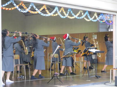 吹奏楽部によるコンサートが行われました。プログラムにあるように、クリスマスの曲を含め約1時間たっぷりと演奏しました。後半は北風が強くなり寒さが増しましたが、手拍子をしたり歌詞を口ずさんだりして盛り上がる曲が多かったです。プログラムは、生徒が端末を使って自分で作成したとのことで、これも素晴らしいと思います。