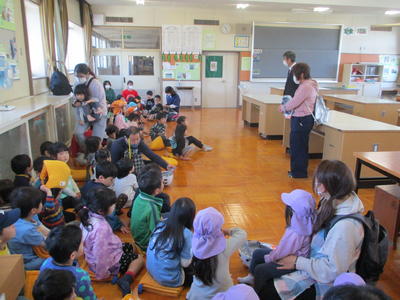 あかねの虹保育園の園児と先生が来校しました。実際の避難を想定し、場所や移動の仕方、非常食・水などを体験しながら確認していました。園児の皆さんは挨拶ができ、先生の話ををよく聞いていてお利口でした。