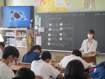 後期の実習も残すところ、あと2日となりました。本日は社会の研究授業が行われました。日本と世界の結びつきについて、貿易の現状から今後について考える中で、世界の中での日本の役割や他国との関係について主体的に学ぶことができました。