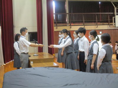 先日の投票結果を受け、朝会にて校長から当選者に任命書を渡し、正式に生徒会が新しい体制に引き継がれました。