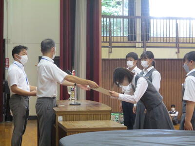 始業式では、校長先生から夏休み中に大きな事故がなく無事だったこと。タイムカプセル開封で卒業生が来校し、態度が良かったこと。賞状伝達は、硬筆展、水泳、野球部、男女テニス部、吹奏楽部。おめでとうございます。