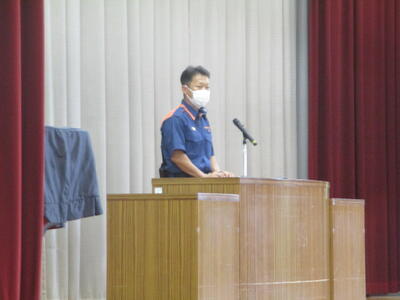 避難訓練は、雨天のため初期動作、初期消火、通報の訓練のみを行い、その後は体育館にて消防署の方からお話をいただきました。119番通報で冷静に正確に情報を伝えること、家族と避難場所を確認しておくこと、困ったことがあったら相談することなどについてのお話しでした。また、職員向けに消火栓の扱い方についても詳しく教えてくださいました。先日の救命救急の研修に引き続き消防署の方にお世話になりました。