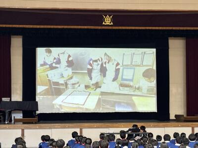 今回は給食委員による発表でした。残菜が多いことが課題なので、それを解決すべく給食委員の皆さんがアイデアを提案してくれました。