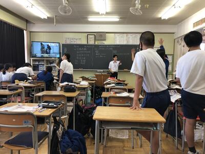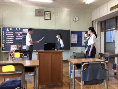 工事中の朝会はオンラインで行います。今日は読書感想文と新人大会の表彰(女子卓球、男子テニス、男子剣道)と校長先生の話でした。