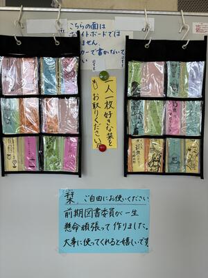 今、図書館では前期図書委員が作成した素敵な栞を貰えます。読書の秋にお気に入りの栞で読書の跡を共にしてはいかがかな。