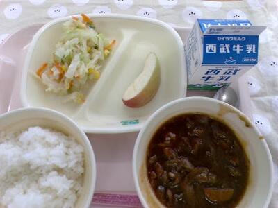 10/8(水)の給食 投稿: 教頭 (07:01) 今日の給食は、ご飯 ハヤシライス、コールスローサラダ、りんごです。ハヤシライスは、ご飯との相性がよく、入っている具材とマッチしてとても美味しかったです。コールスローサラダは、酸味が強かったけれど、美味しかったです。りんごは、とても甘くて美味しかったです。1-1給食委員 -