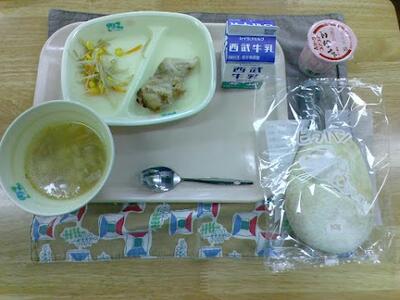 10/9(木)の給食 投稿: 教頭 (08:30) 今日の給食は、ピタパン、牛乳、ABCスープ、ごぼうサラダ、鶏肉の香草焼き、ヨーグルトです。ピタパンとごぼうサラダを一緒に食べると、爽やかな味わいでした。最後にヨーグルトを食べるとさっぱりとした味わいでした。1-2給食委員 -