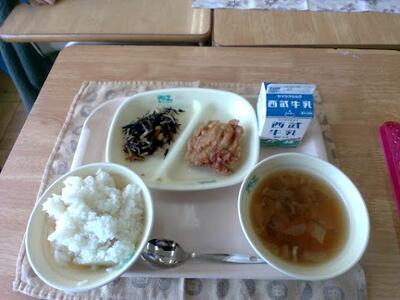 1/29(木)の給食 投稿: 教頭 (17:09) 今日の給食は、ご飯、牛乳、鶏肉の唐揚げ、ひじきと大豆の炒めに、芋の子汁です。唐揚げはとってもジューシーで美味しかったです。芋の子汁はお芋の食感が少しとろみがあり食感を楽しめました。3−4給食委員 -
