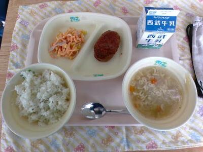 今日の給食は、ガーリックライス、牛乳、ハンバーグのケチャップソース、とことこキャロットサラダ、ABCスープです。ハンバーグのケチャップソースは、ハンバーグとケチャップのソースがよく合っていてとてもおいしかったです。ABCスープは、アルファベットの形のマカロニがたくさん入っていておいしかったです。