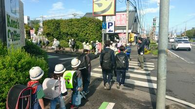 小学生の歩みに合わせ、立ち止まって道を譲ったり、先に通れるよう待ったりしている姿です。
