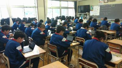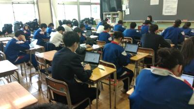 R8.4.23②_全国学力・学習状況調査 投稿: 教頭 (14:37) 「全国学力・学習状況調査」を実施しました。3年生が、国語、数学、英語に取り組みました。英語はデジタル端末を用いたオンライン方式で回答しました。 生徒たちは一人一台のクロムブックを手に、操作に戸惑うことも少なく、集中して回答を進めていました。