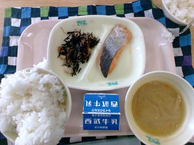 今学期最後の給食は、ご飯、牛乳、鯖のカレー焼き、茎わかめの炒め煮、春キャベツの豚汁でした。